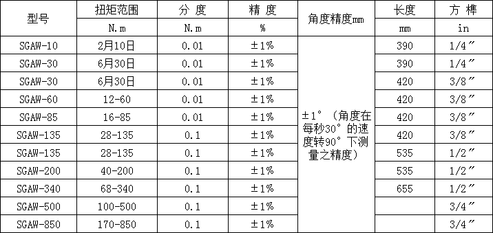 100N.m帶通訊接口連接電子力矩扳手,通訊接口數顯扭力扳手 鑄衡廠家的SGAW通訊接口數顯扭力扳手是一款新型的數顯扳手。可以直接并準確的讀出扭矩-角度值,使用簡單,易于操作。適用于汽車行業、機械行業等的螺栓緊固及控制。 通訊接口數顯扭力扳手規格型號 通
